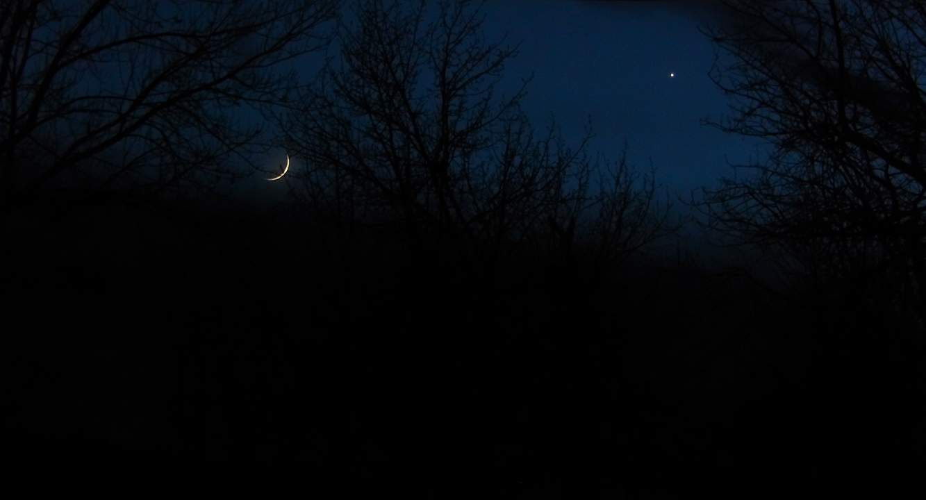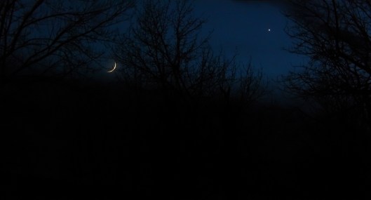 Tuesday night’s crescent moon (with earthshine faintly illuminating the rest of the moon)… and Venus.